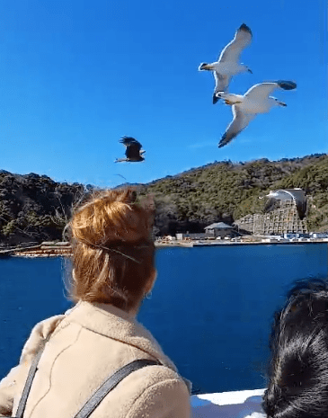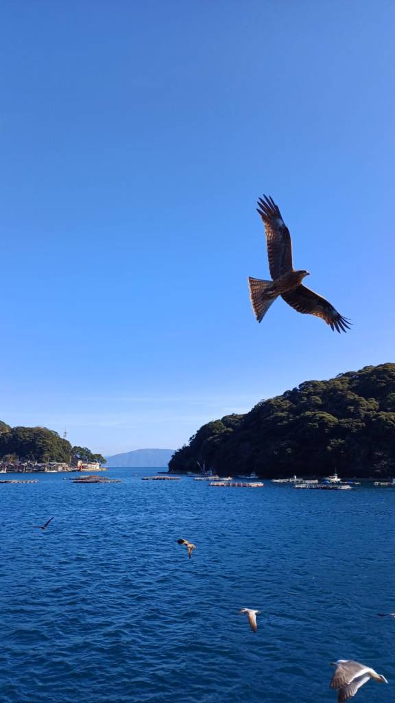 Next on the itinerary was a visit to the charming fishing village of Ine, where we explored the iconic Funaya boathouses. Located in Kyoto prefecture the Funaya (boathouses) have been used by the fishermen for centuries .The sight of them, nestled along the bay with their boats tethered nearby, was a glimpse into the way of life that has persisted in this tranquil village for generations. After taking a few photos, we boarded a small ferry to feed the seagulls and eagles—a highlight of the trip.