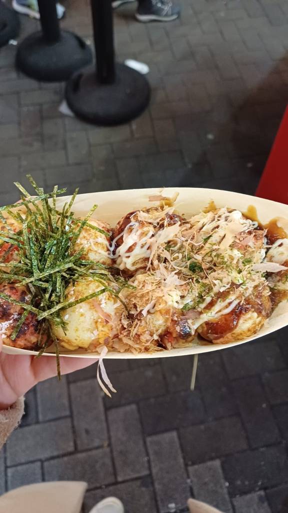 - Takoyaki: This is a ball shaped cuisine made of dough and filled with octopus. Topped with takoyaki sauce and bonito flakes, it is usually fried. You can find lots of this across the street. Whilst it wasn’t my favourite, it is always best to give everything a try!