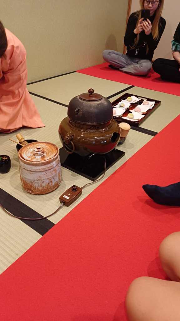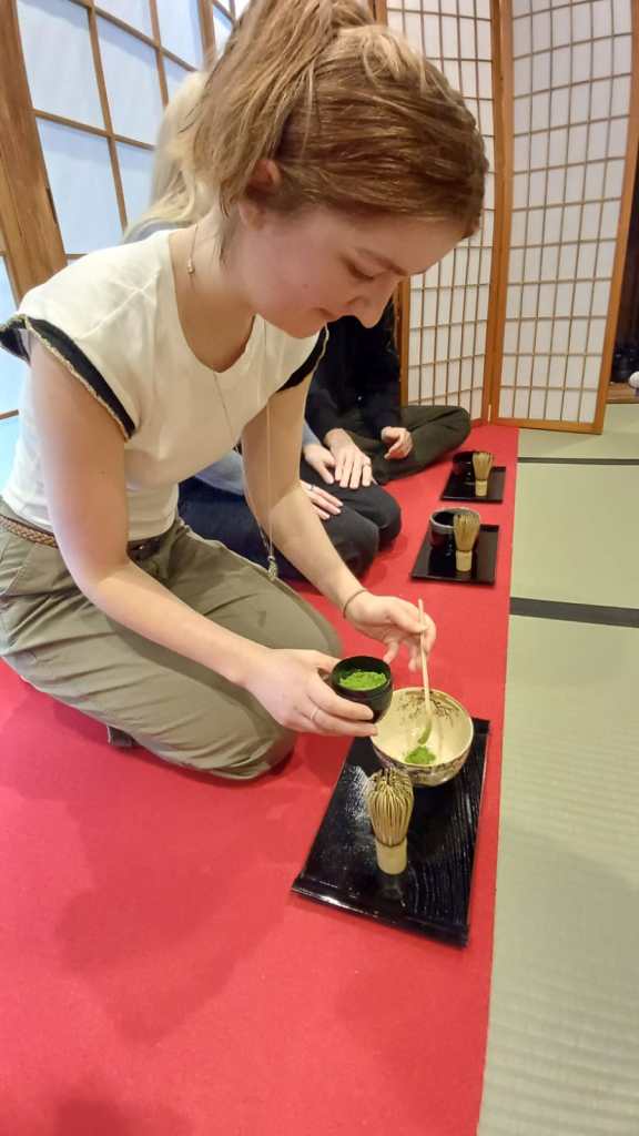 Located in Dotonbori the teacher taught us about the essence of Japanese tradition Andrea ceremony etiquette. It was an interesting experience where every gesture—such as the way you sit and how you hold the cup—follows a set of precise etiquette. The process of making matcha is intricate, and while I won’t attempt to explain all the steps (as I’m sure I’d butcher it), here’s a brief overview: the master carefully pours the water and whisks the matcha powder until it dissolves into a smooth, frothy tea. The tea is then presented in a specific manner, and guests are expected to drink it according to certain customs.