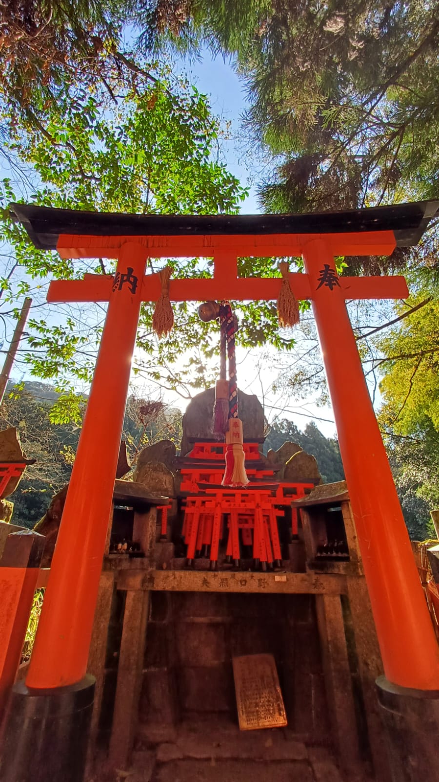 . After doing a bit of research, we learned that this shrine is dedicated to Inari, the Shinto god of rice, agriculture, and prosperity. On the back of each gate, you’ll find inscriptions in Japanese, displaying the names of the donors who contributed to the shrine. There are several routes that you can take, each with varying in length and difficulty. We followed the path of the torii gates to fully immerse ourselves in the site. As you’re walking through, you find yourself mesmerised by how the sun’s rays shine through the gates and dance off of them across the trees. There are several complexes that have Komainu – sub-shrines, where you can see many statues of foxes. They are believed to be the messengers of Inari and typically seen as holding a set of keys in their mouths; symbolic of a key to rice granaries.