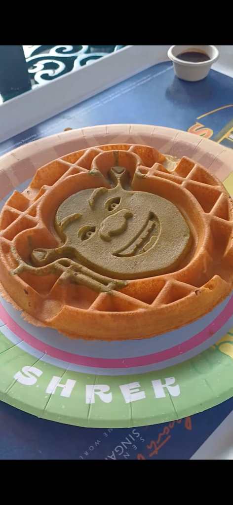 Far Far Away was a blast too. Growing up with Shrek made it feel wacky and fun. We even met Fiona, which was random but hilarious. The themed dessert had Shrek’s face on it—nice touch, though the taste was dry and bland (classic theme park snack). As with any theme park: overpriced and overcrowded, but worth it if you’ve got the patience.